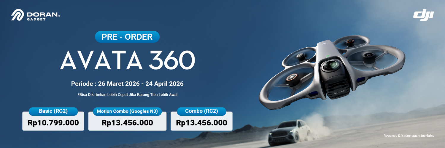 Promo pre order DJI Avata 360 di Doran Gadget berlangsung mulai dari 26 Maret – 24 April 2026 dengan kuota priority stock melalui website Doran Gadget. Untuk pengiriman unit dijadwalkan mulai 24 April 2026 atau lebih cepat apabila stok tersedia lebih awal.