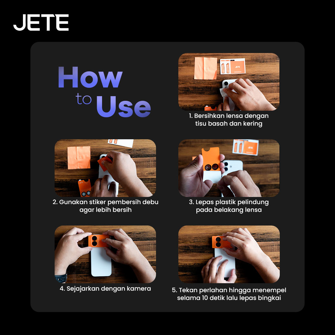 Tak hanya dirancang lebih tangguh dan kerjernihan yang memukau saja, JETE Shield Pro Lens juga didesain memiliki daya rekat yang kuat pada permukaan dan sisi lensa. Selain memberikan perlindunganyang optimal, membuat pelindung lensa kamera ini tidak mudah jatuh saat digunakan dalam waktu lama dan intens.