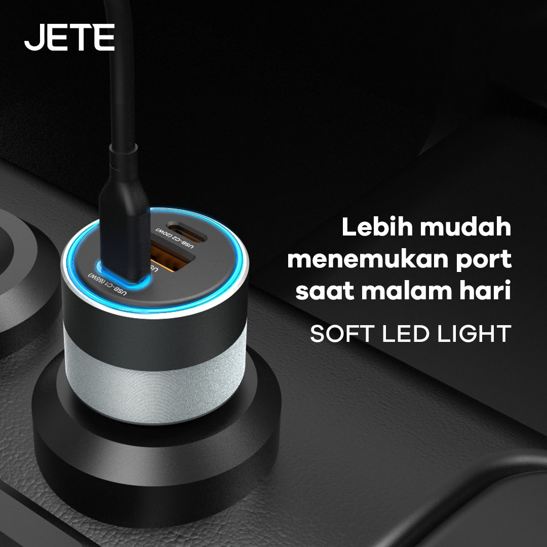 Bagian luar charger mobil JETE J8 Series dilengkapi dengan lampu Soft LED yang melingkar di bagian atas. Ini akan memudahkan Anda saat menggunakannya di dalam mobil saat malam hari. Terutama saat memasang dan melepas perangkat charger ini.