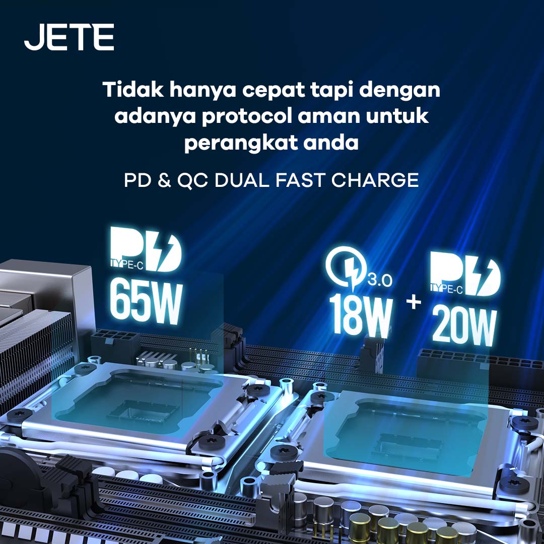 Fitur pengisian daya JETE J8 Series dilengkapi protokol yang aman bagi perangkat. Untuk fitur Power Delivery Type-C memiliki daya 30W. Selain itu terdapat dua port Quick Charge 3.0 dengan daya masing-masing 18W. Penyaluran daya ini disesuaikan berdasarkan kebutuhan perangkat.