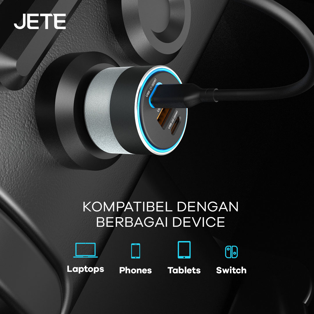Charger mobil JETE J8 Series kompatibel digunakan di berbagai jenis dan tipe perangkat. Mulai dari smartphone, laptop, tablet, case TWS, dan lainnya. Anda bisa melakukan pengisian daya dengan mudah selama dalam perjalanan.