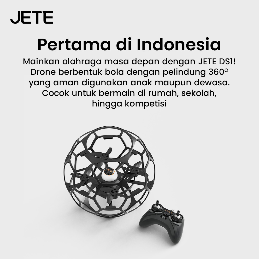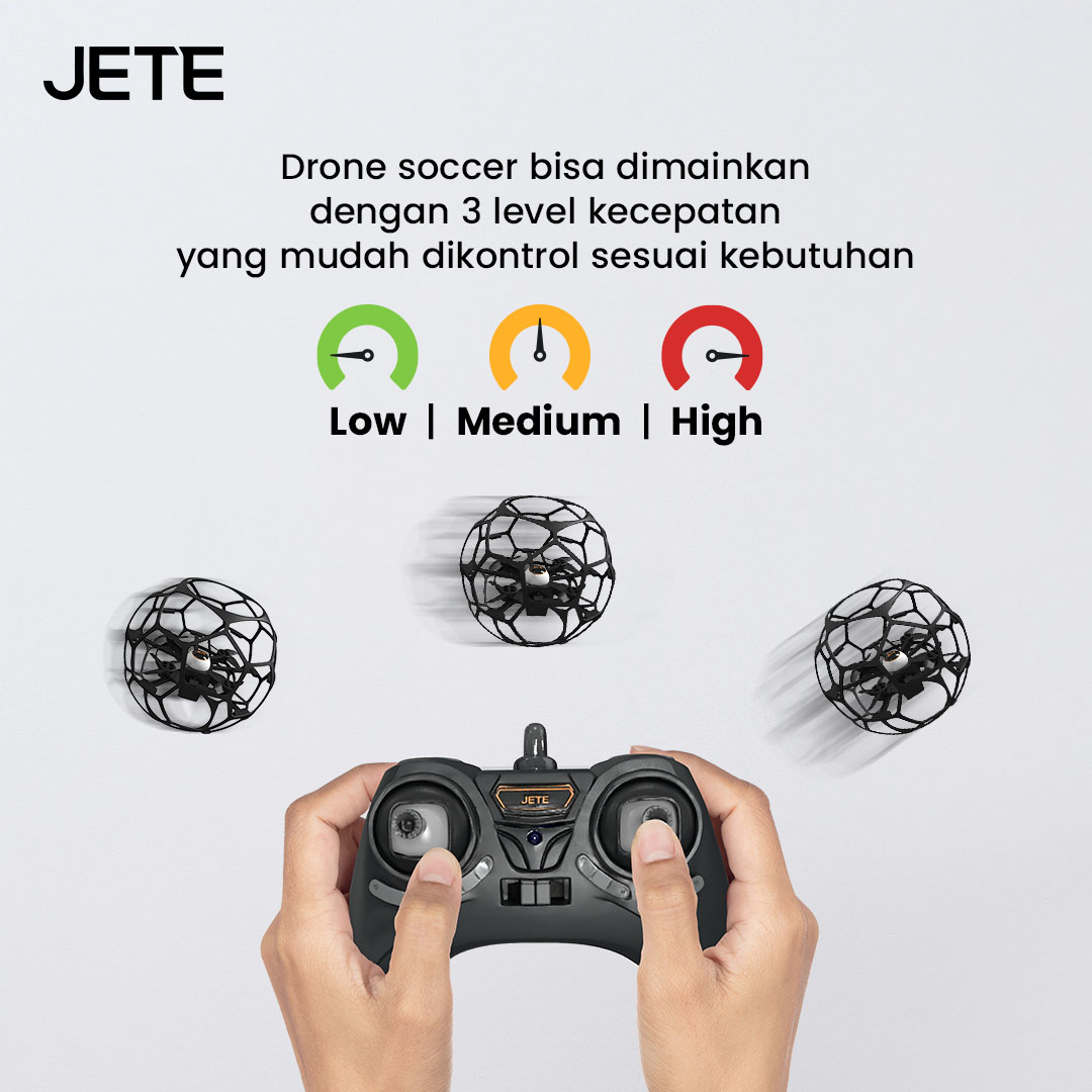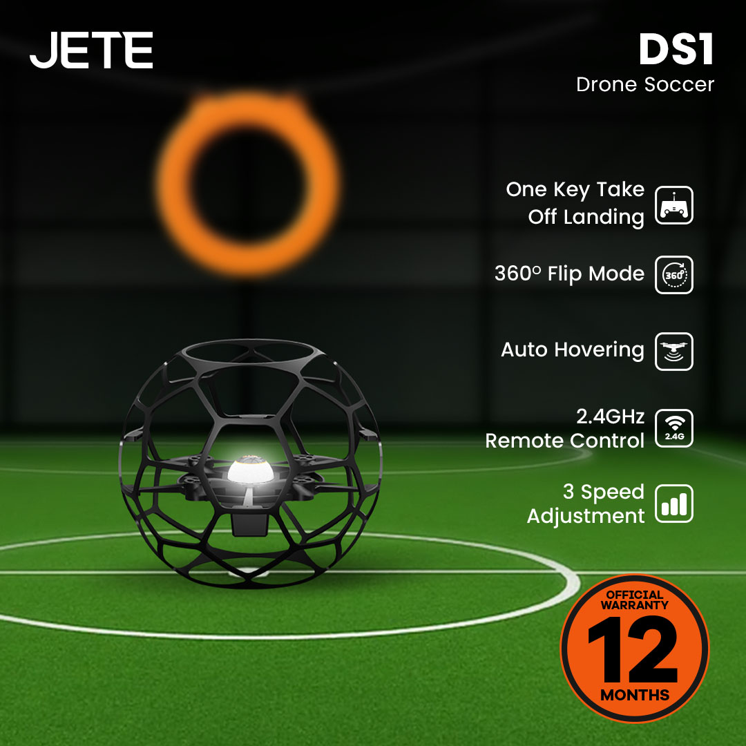 Drone soccer JETE DS1 adalah tipe drone ball untuk permainan bola yang inovatif di masa depan. Desain ringkas, kontrol mudah, dan dilengkapi pelindung, membuat penerbangan maupun manuver semakin aman dan nyaman.