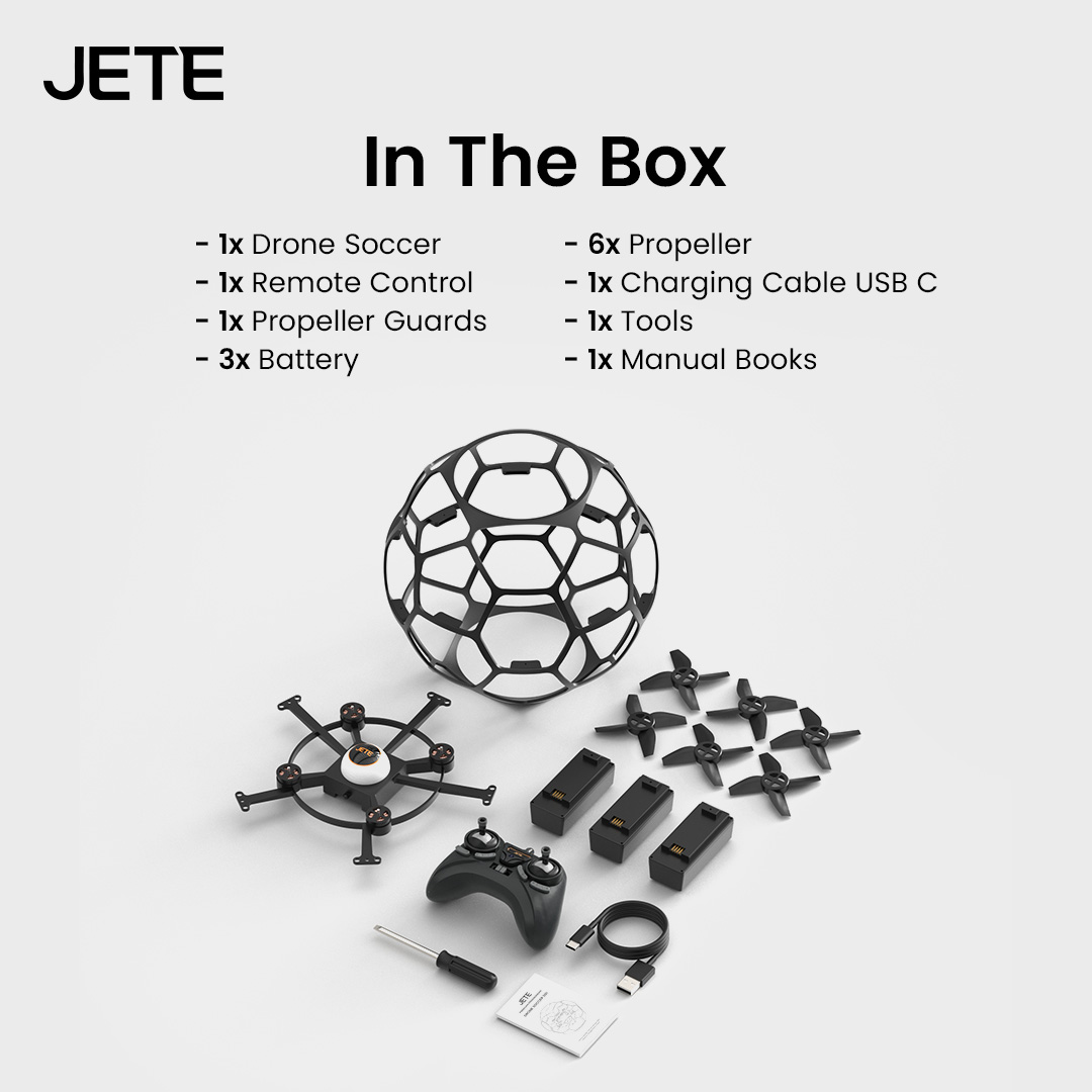 Dapatkan paket lengkap dalam setiap pembelian drone soccer JETE DS1. Mulai dari pesawat drone, controller, pelindung baling-baling, baterai, hingga perangkat pengisian daya. Termasuk juga perangkat pemasangan dan manual book.