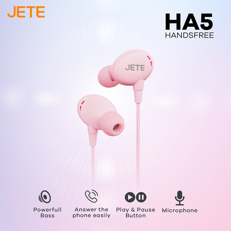 Handsfree JETE HA5 Series adalah pilihan tepat bagi Anda yang suka dengan kepraktisan. Didukung dengan berbagai fitur unggulan, membuat pengguna lebih nyaman saat melakukan panggilan maupun menikmati konten-konten favorit.