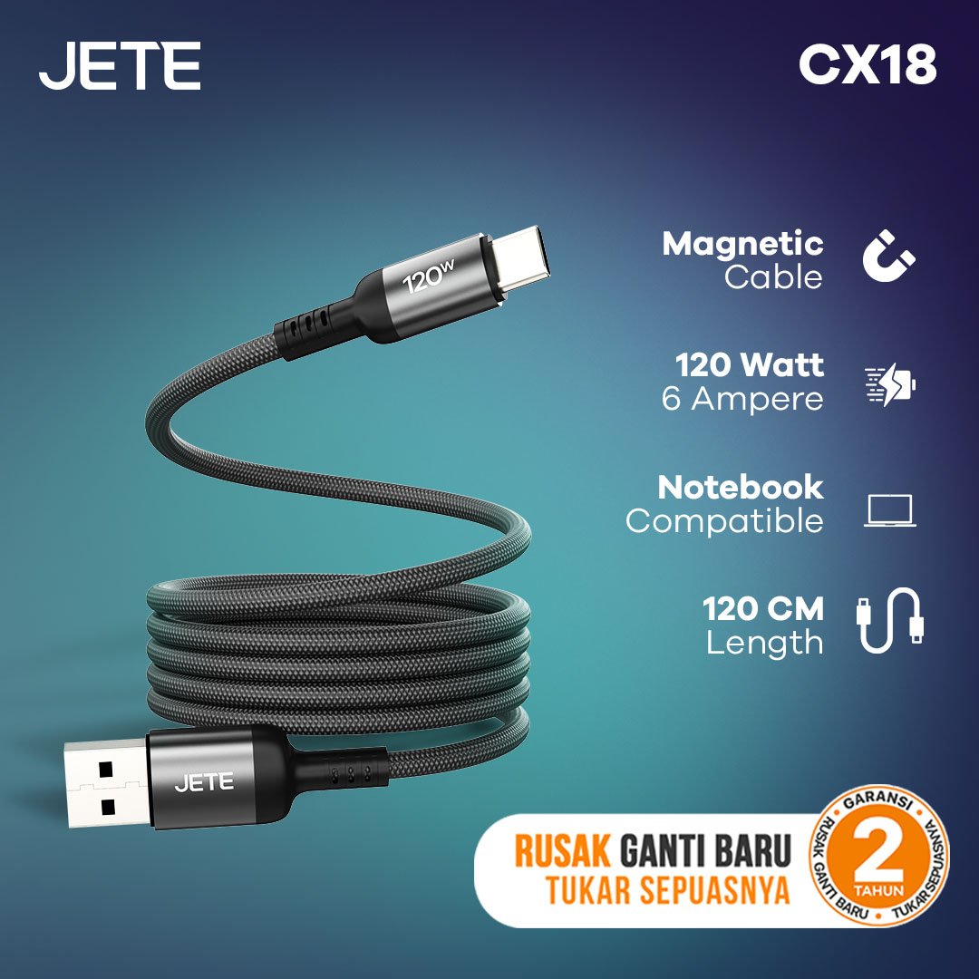 Daya 120W pada JETE CX18 Series mampu mengisi daya lebih cepat hingga 5 kali lipat dibanding kabel yang tidak menggunakan fitur fast charging. Kemampuan tersebut dapat digunakan untuk mengisi daya smartphone flagship dan gadget unggulan.