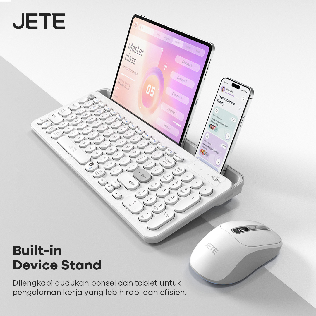 Keunggulan dari keyboard dan mouse JETE MKS201 lainnya adalah dibekali dengan dudukan ponsel di bagian atasnya. Memudahkan pengguna saat mengetik dengan layar tablet maupun smartphone. Memberikan pengalaman yang lebih praktis dan efisien. Cukup letakkan saja, dan mulailah mengetik!