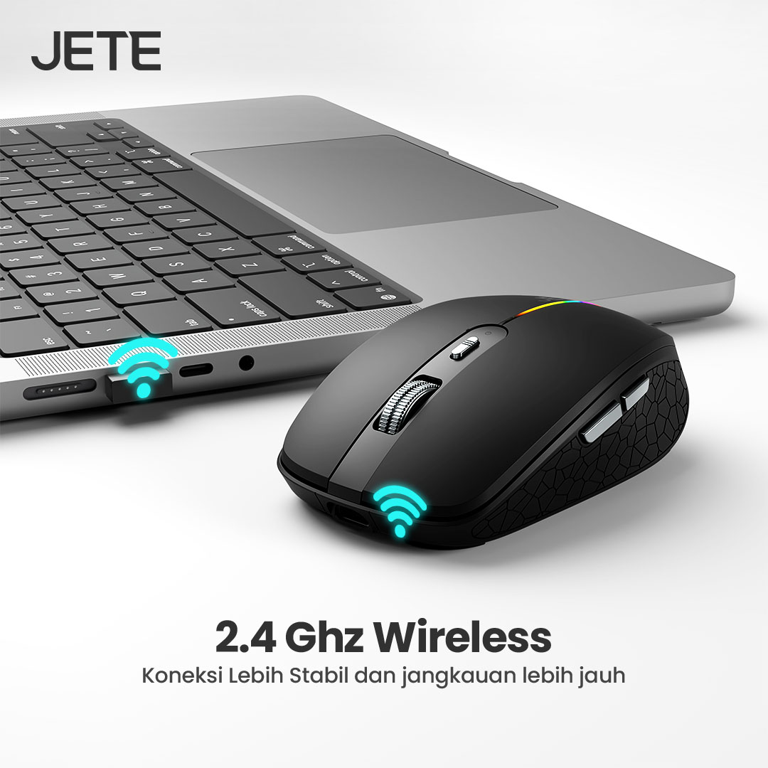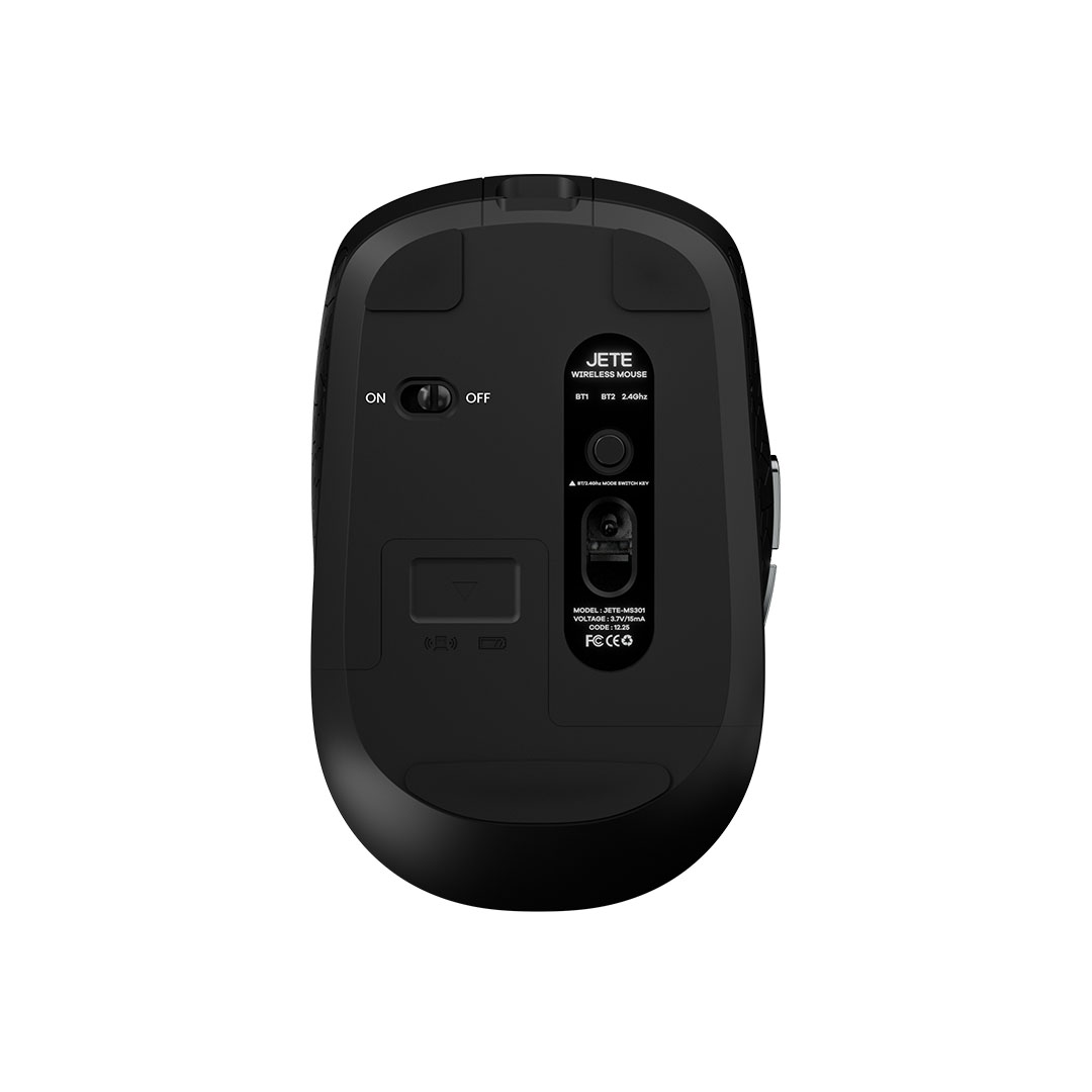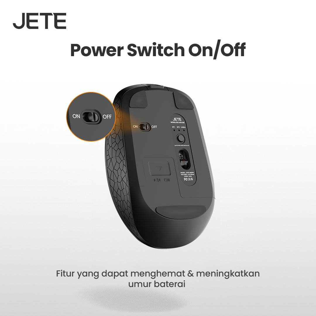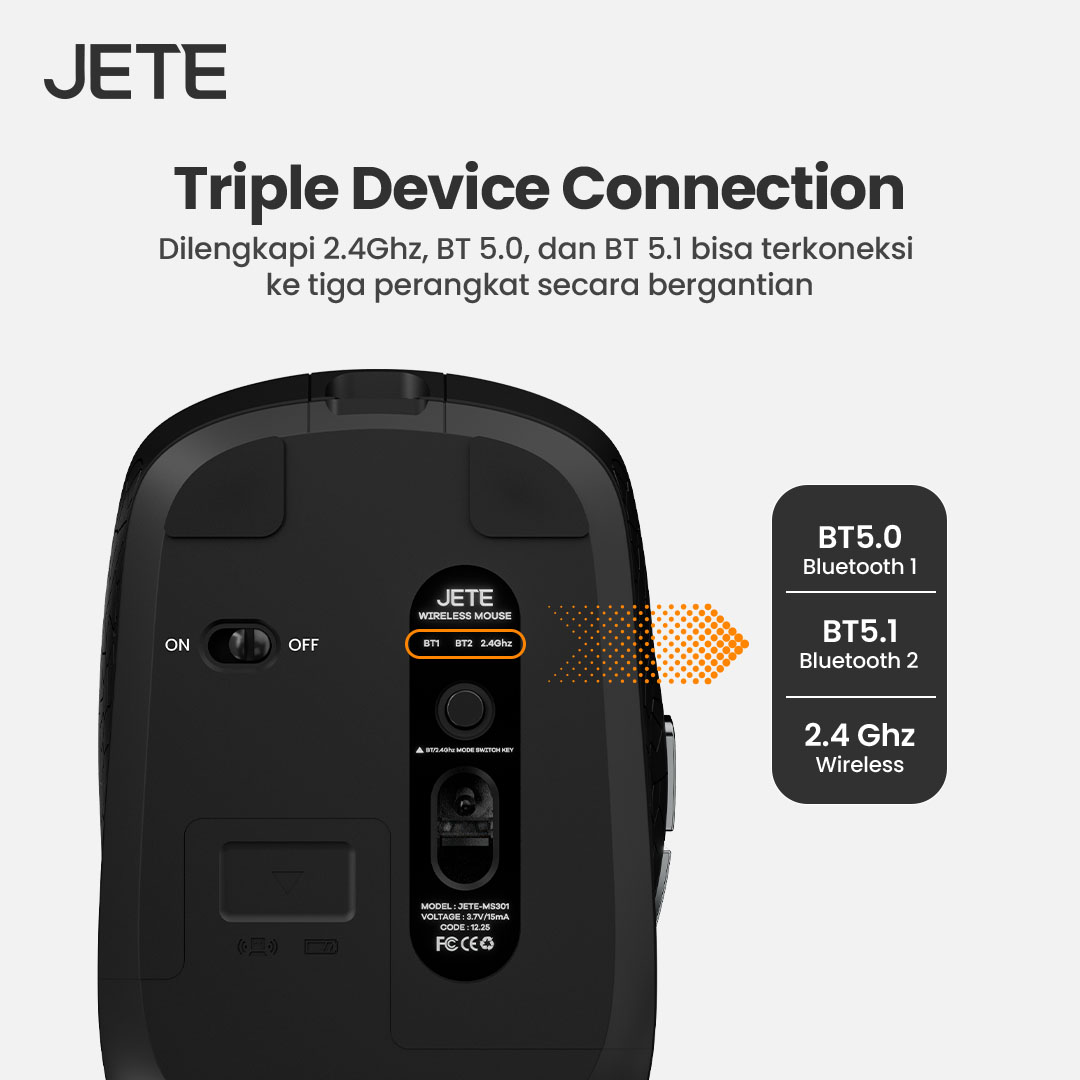 Mouse wireless JETE MS301 memiliki tiga mode koneksi. Yakni dengan menggunakan Bluetooh 5.0 dan 5.1. Selain itu, juga kompatibel dengan penggunaan mode wireless dengan frekuensi 2.4Ghz yang menjadikan koneksinya tetap stabil dan lancar.