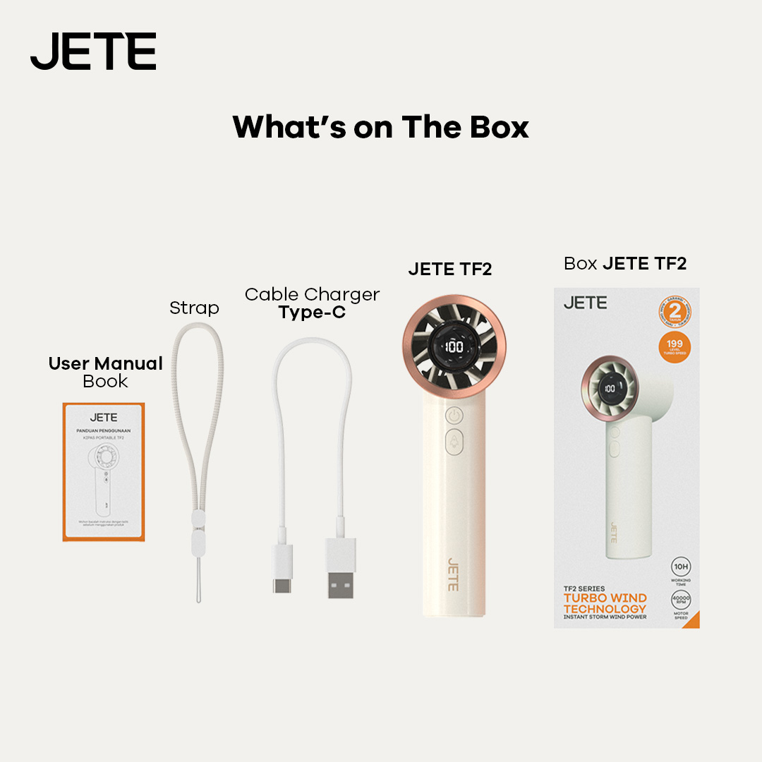 Setiap pembelian JETE TF2 terdapat paket lengkap dalam satu box yang praktis. Mulai dari kipas angin, kabel charger Type-C, strap, dan buku manual. Dengan begitu, pengguna tak perlu lagi repot membeli kabel charger tambahan saat melakukan pengisian daya.