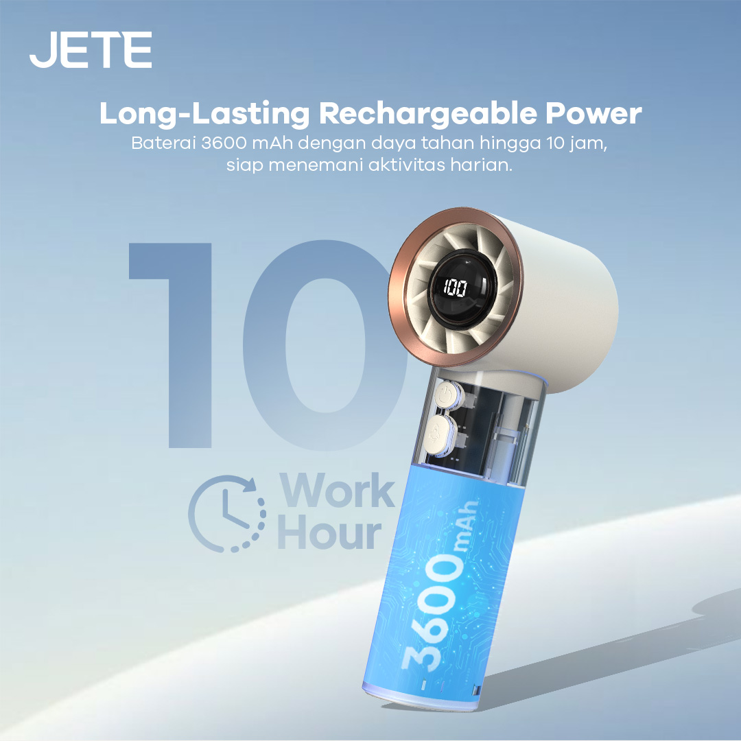 Tak perlu khawatir kipas cepat mati di tengah penggunaan. Dengan baterai 3600mAh, JETE TF2 mampu bertahan sampai 10 jam setelah pengisian penuh. Ideal untuk menemani kerja, belajar, traveling, atau aktivitas outdoor tanpa gangguan.