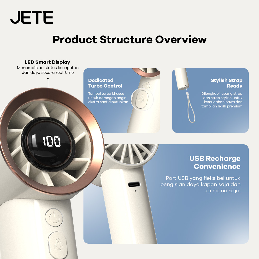 JETE TF2 hadir sebagai solusi praktis untuk kamu yang membutuhkan kesejukan di setiap momen. Aliran udaranya lebih fokus, terasa sejuk, dan nyaman digunakan berkat desain ergonomisnya. Dengan tambahan LED dan bentuk compact, kamu bisa membawanya dengan mudah ke berbagai aktivitas.