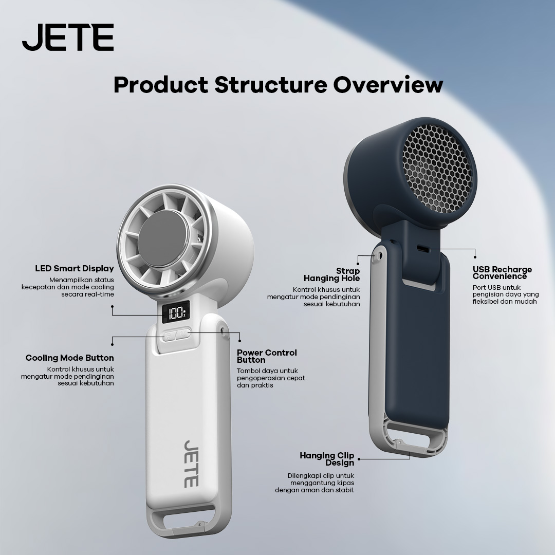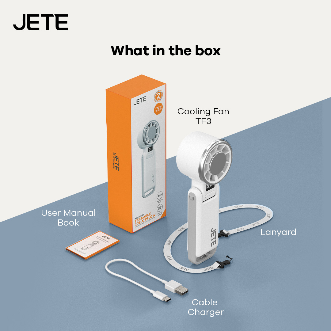Setiap pembelian JETE TF3 terdapat paket lengkap dalam satu box yang praktis. Mulai dari kipas angin, kabel charger, strap lanyard, dan buku manual. Dengan begitu, pengguna tak perlu lagi repot membeli kabel charger tambahan saat melakukan pengisian daya.