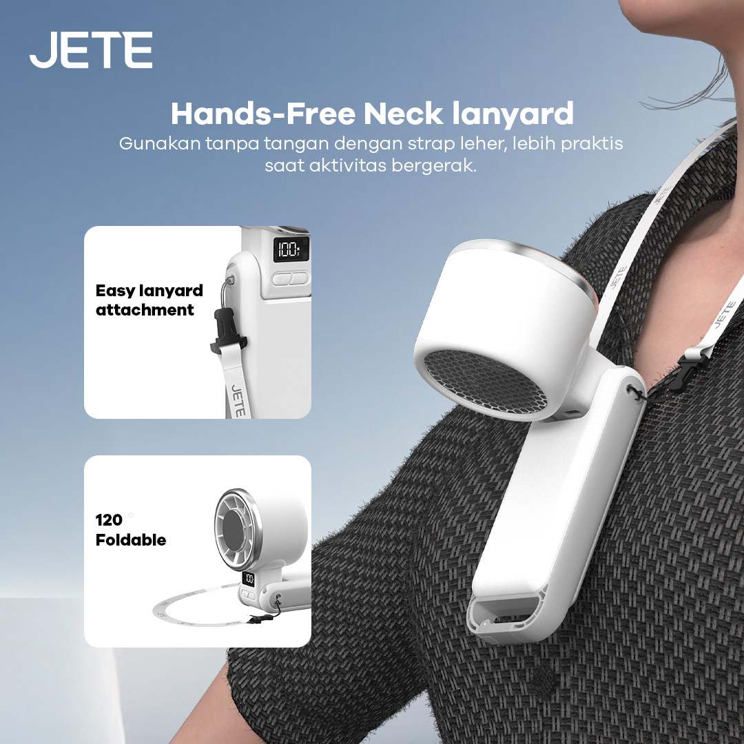 Kini, kamu bisa menggunakan kipas angin mini JETE TF3 tanpa harus digenggam. Bagian leher kipas bisa ditekuk hingga 120°. Selain itu, dibekali dengan strap di bagian leher tersebut. Kamu pun dapat mengalungkannya di leher untuk penggunaan lebih praktis tanpa menggganggu aktivitas gerakmu.