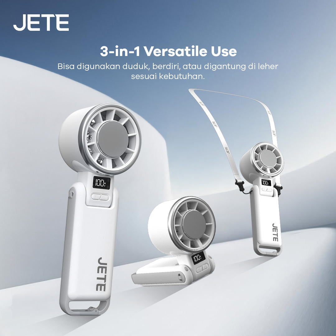 Kipas angin JETE TF3 mendukung untuk berbagai mode penggnaan. Kamu bisa menempatkannya dalam posisi kipas secara berdiri, duduk, maupun digantungkan di leher. Desainnya yang kokoh juga memberikan kenyamanan saat digenggam dalam waktu yang lama.