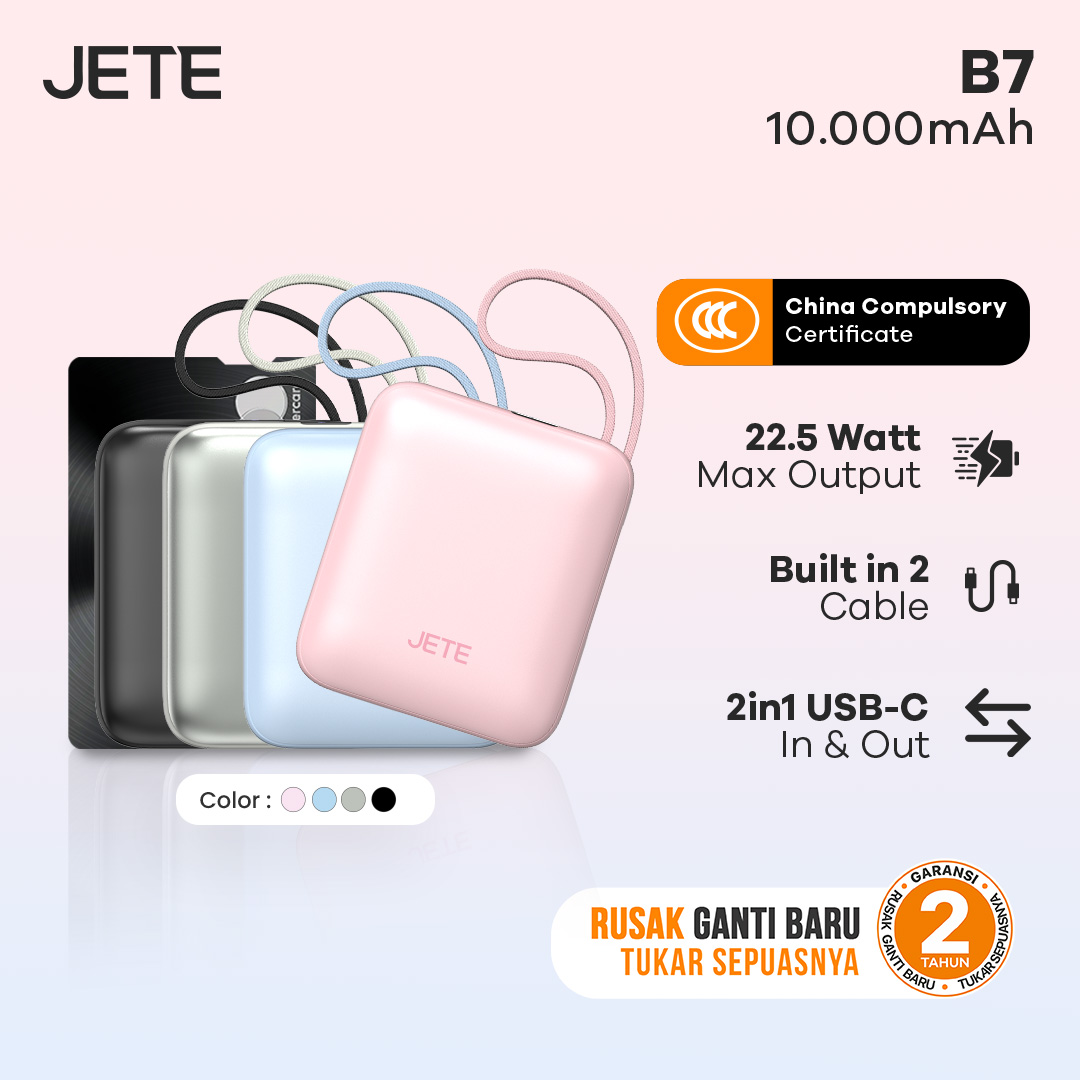 Tak perlu repot lagi membawa kabel tambahan saat traveling. JETE B7 Series sudah dibekali dengan dua kabel dengan type USB-C dan Lightning. Perjalanan dan aktivitas di luar ruangan semakin nyaman.