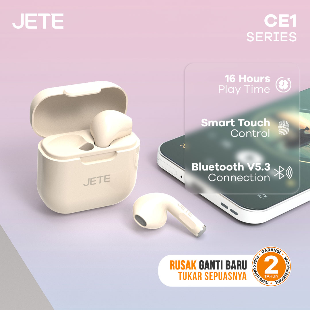 TWS JETE CE1 Series adalah perangkat audio yang ringkas dengan koneksi lancar untuk berbagai aktivitas. Mulai menunjang pekerjaan seperti meeting online, berolahraga, dan hiburan. Desainnya yang ringkas, nyaman di telinga dan tidak bikin sakit.