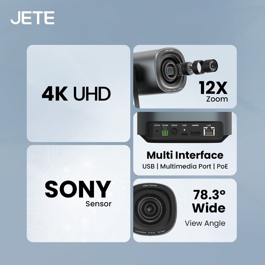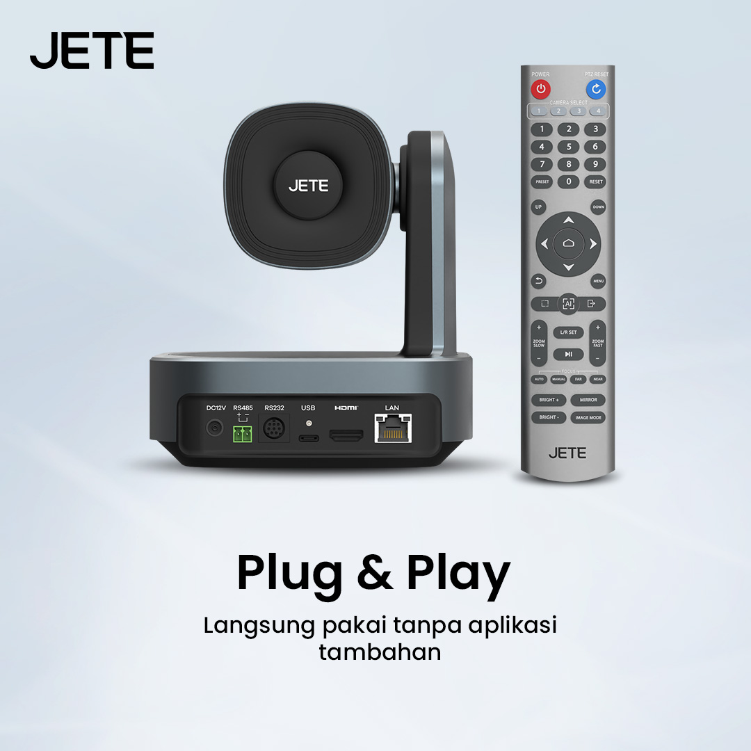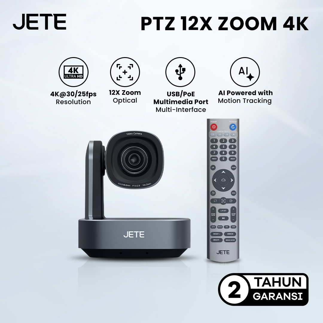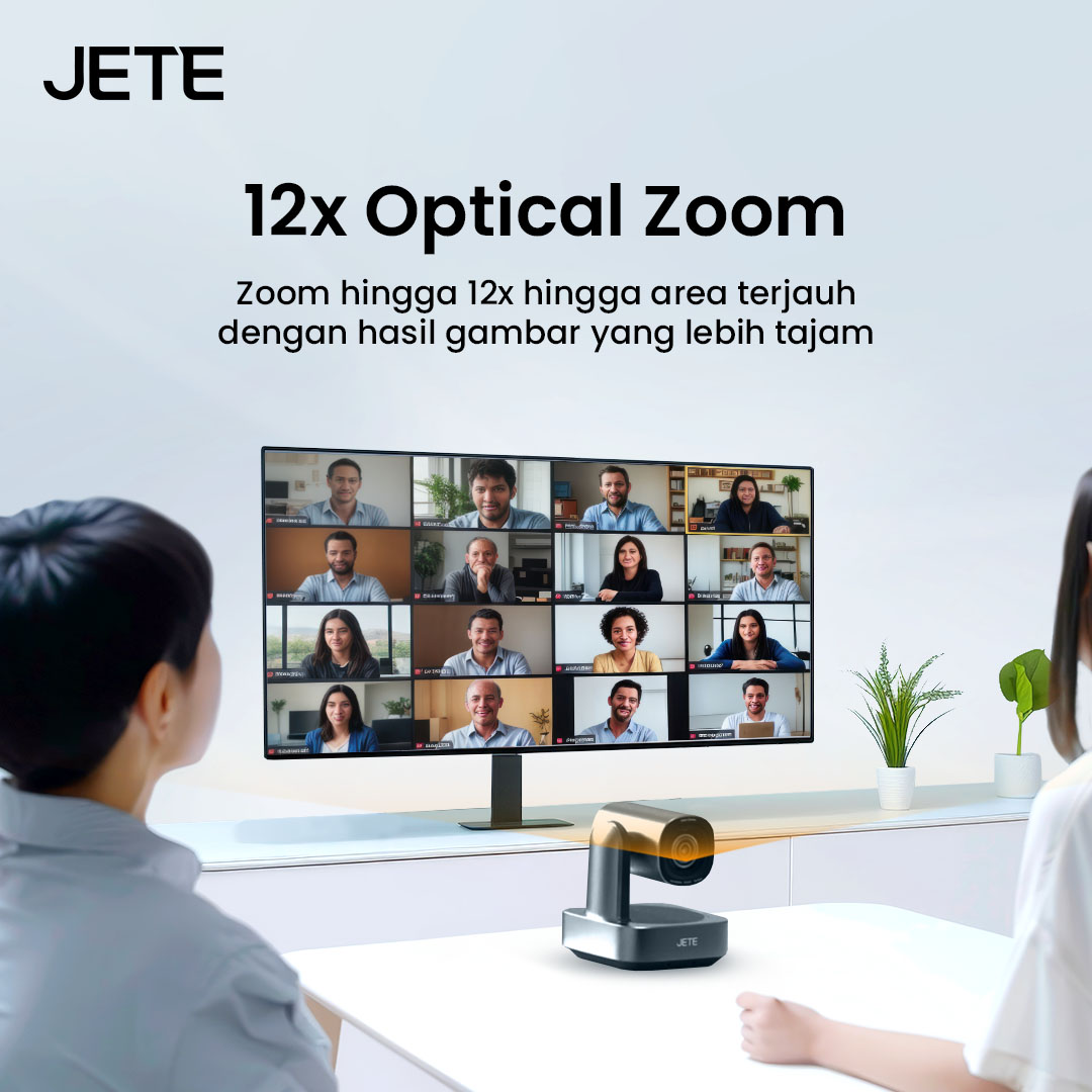 JETE PTZ 12X ZOOM 4K adalah kamera untuk meeting online dan konferensi dengan kualitas gambar yang jernih dan unggul. Kompatibel di semua perangkat, sistem operasi, dan software meeting terbaik. Dibekali AI Motion Tracking menjadikannya lebih nyaman dan tetap fokus.