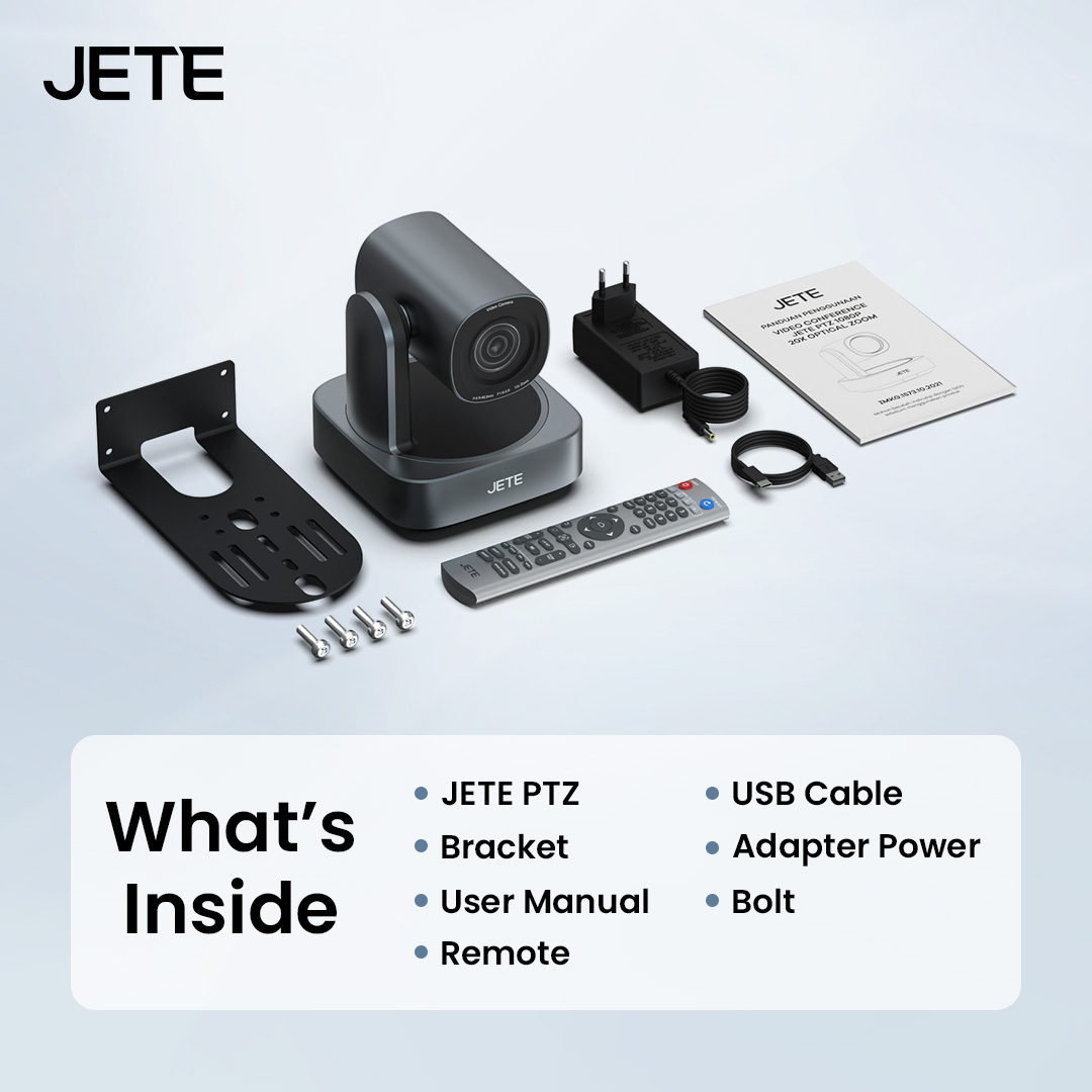 Dalam setiap pembelian JETE PTZ terbaru, sudah mendapatkan paket lengkap. Mulai dari kamera, bracket, remote, user manual, adapter power, hingga kabel USB dan kabel. Semuanya lebih praktis tanpa harus membeli perangkat tambahan.