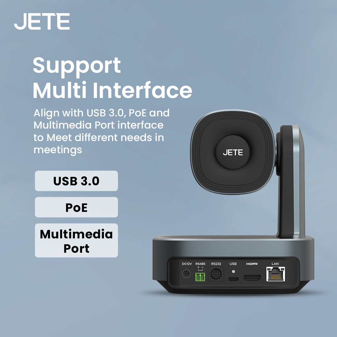 JETE PTZ mendukung penggunaan multi-interface. Mulai dari dengan USB 3.0, PoE, hingga HDMI. Memberikan keleluasaan bagi pengguna sekaligus memberikan kenyamanan di setiap meeting online yang penting kapanpun diperlukan.